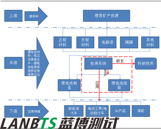 鋰離子電池產(chǎn)業(yè)鏈上游為:鋰礦產(chǎn)資源--中游為鋰電池材料--電芯生產(chǎn)--電芯生產(chǎn)裝備--鋰電池檢測系統(tǒng)提供商和鋰電池組裝企業(yè)--下游主要是鋰電池配套應(yīng)用領(lǐng)域,包括 3C 產(chǎn)品、電動工具、電動自行車、新能源汽車、儲能等行業(yè)。